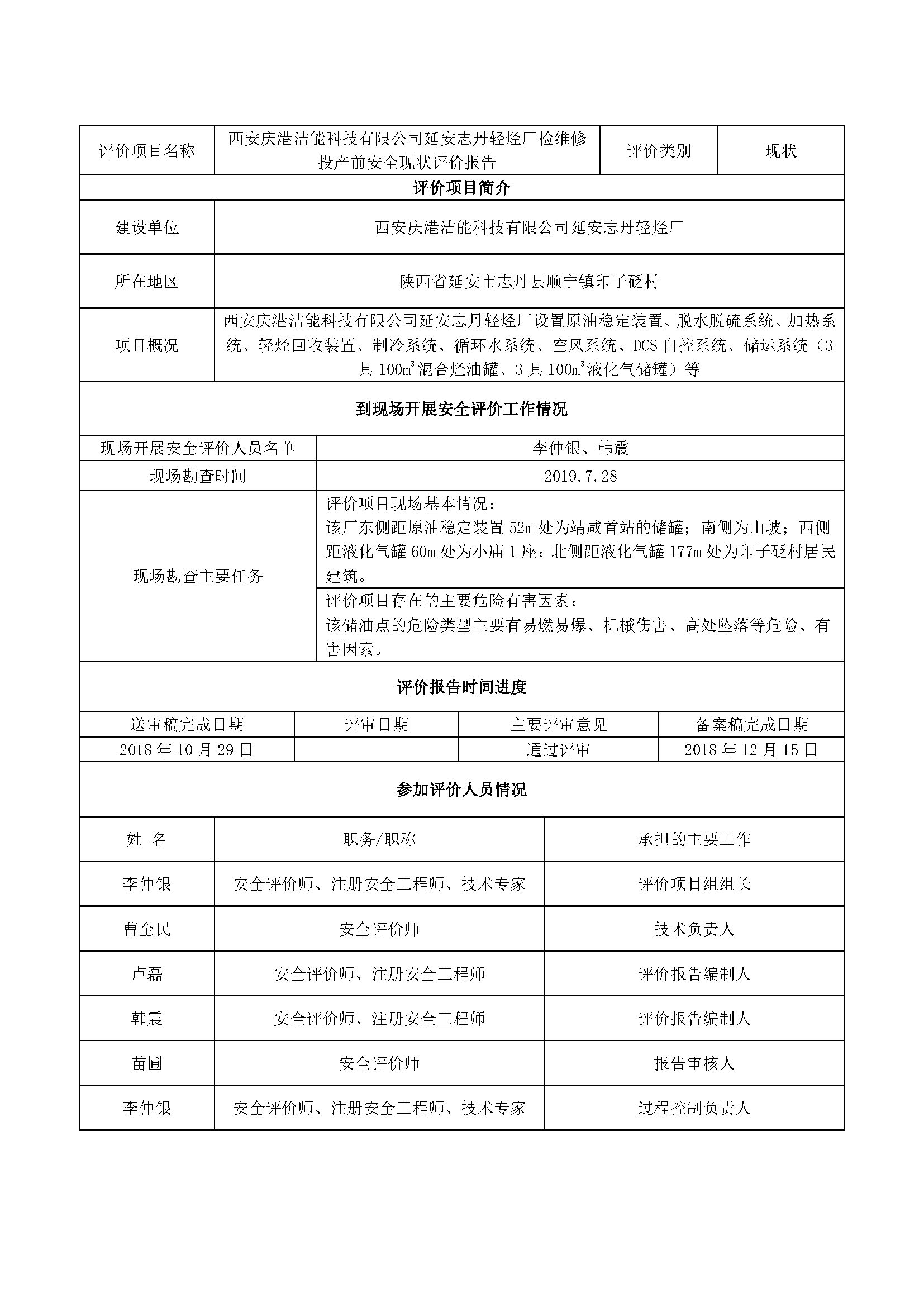 西安慶港潔能科技有限公司延安志丹輕烴廠檢維修投產(chǎn)前安全現(xiàn)狀評價