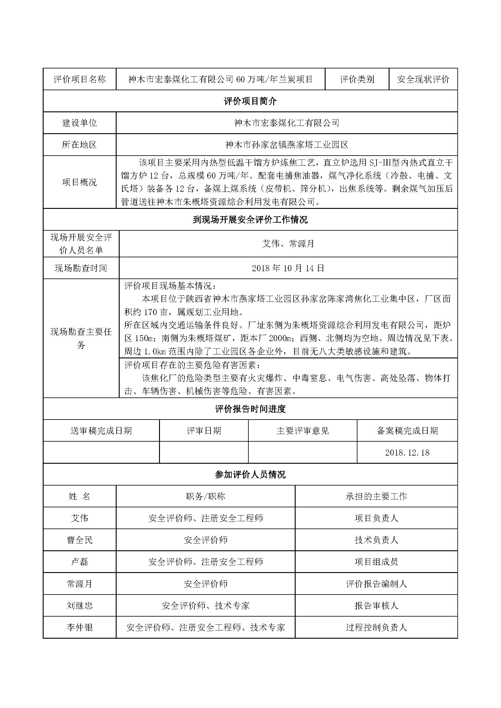 神木市宏泰煤化工有限公司60萬噸年蘭炭項(xiàng)目安全現(xiàn)狀評價(jià)