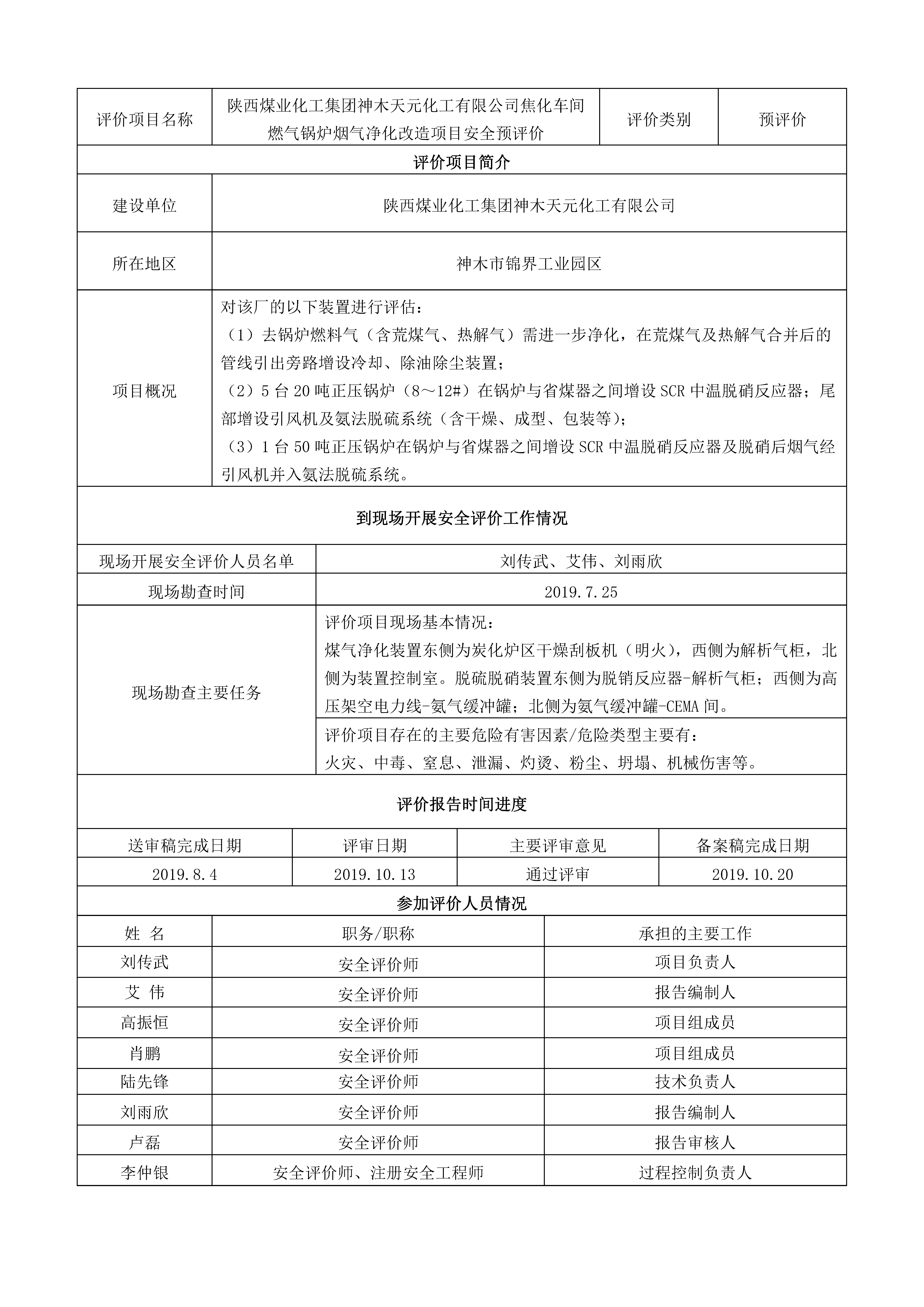 KLDAP[2019]-?;?預(yù)-7 陜西煤業(yè)化工集團神木天元化工有限公司焦化車間燃氣鍋爐煙氣凈化改造項目安全預(yù)評價