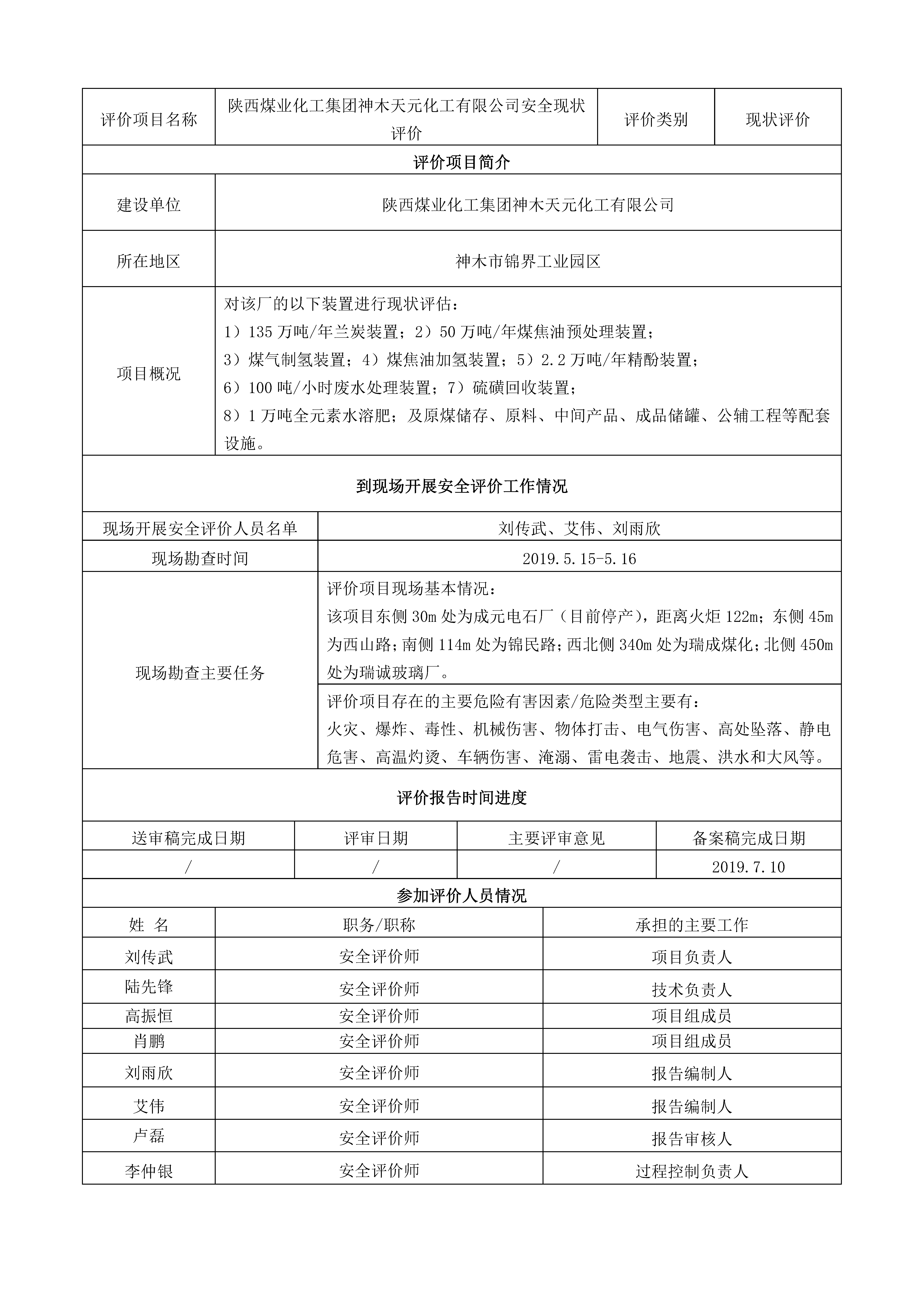 KLDAP[2019]-?;?現(xiàn)-6 陜西煤業(yè)化工集團(tuán)神木天元化工有限公司安全現(xiàn)狀評(píng)價(jià)