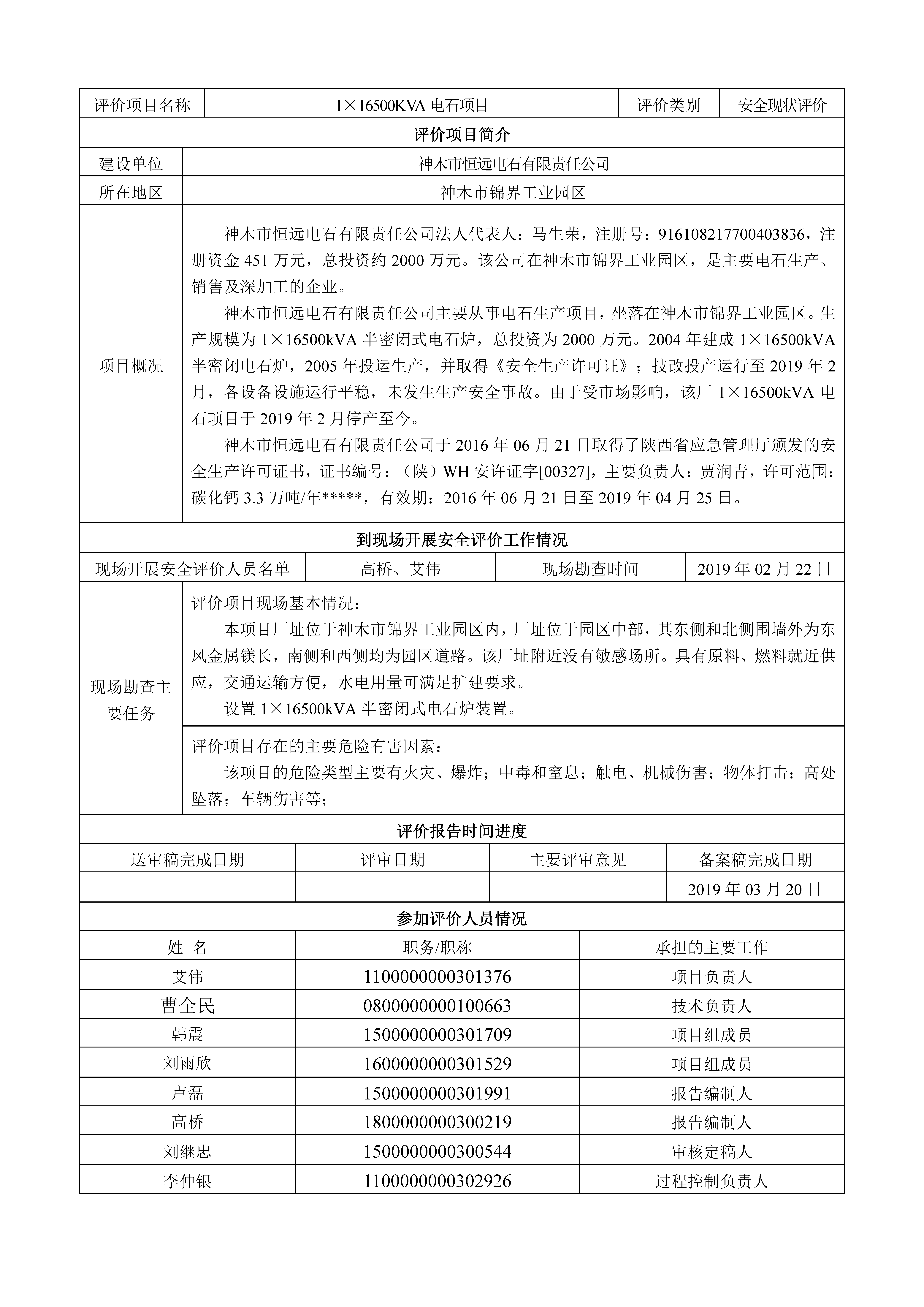 KLDAP[2019]-?;?現(xiàn)-2 神木市恒遠(yuǎn)電石有限責(zé)任公司1×16500kVA電石項目安全現(xiàn)狀評價