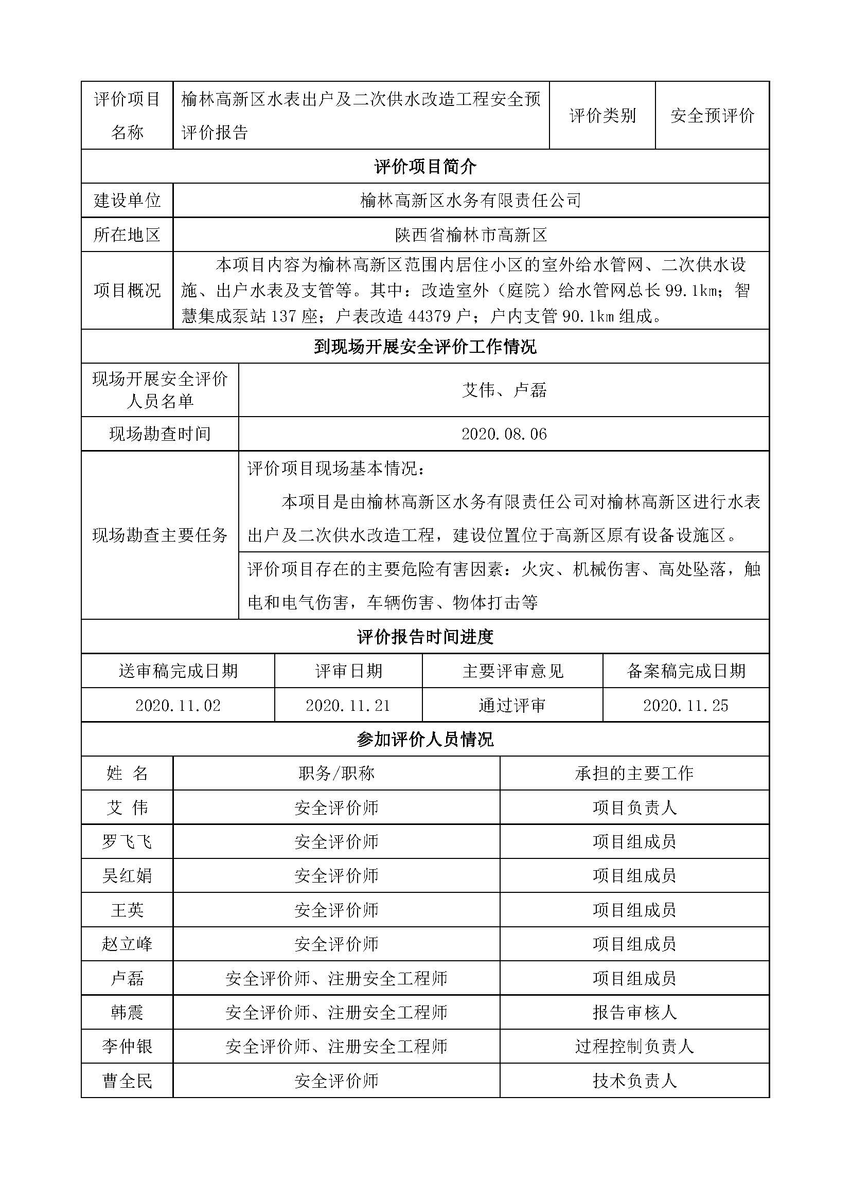KLDAP[2020]-工貿(mào)-預-5 榆林高新區(qū)水務有限責任公司榆林高新區(qū)水表出戶及二次供水改造工程安全預評價