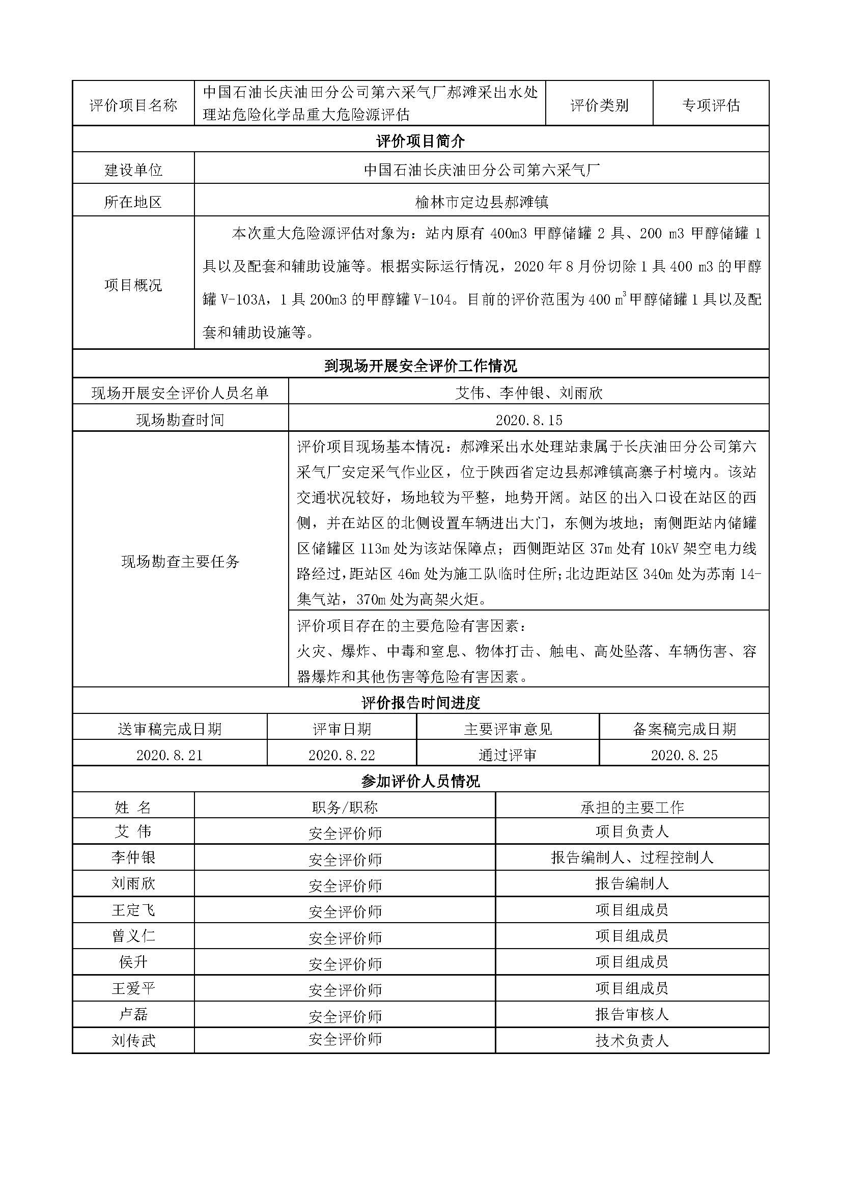 KLDAP[2020]-非煤-重-2 中國石油天然氣股份有限公司長慶油田分公司第六采氣廠郝灘采出水處理站重大危險源評估