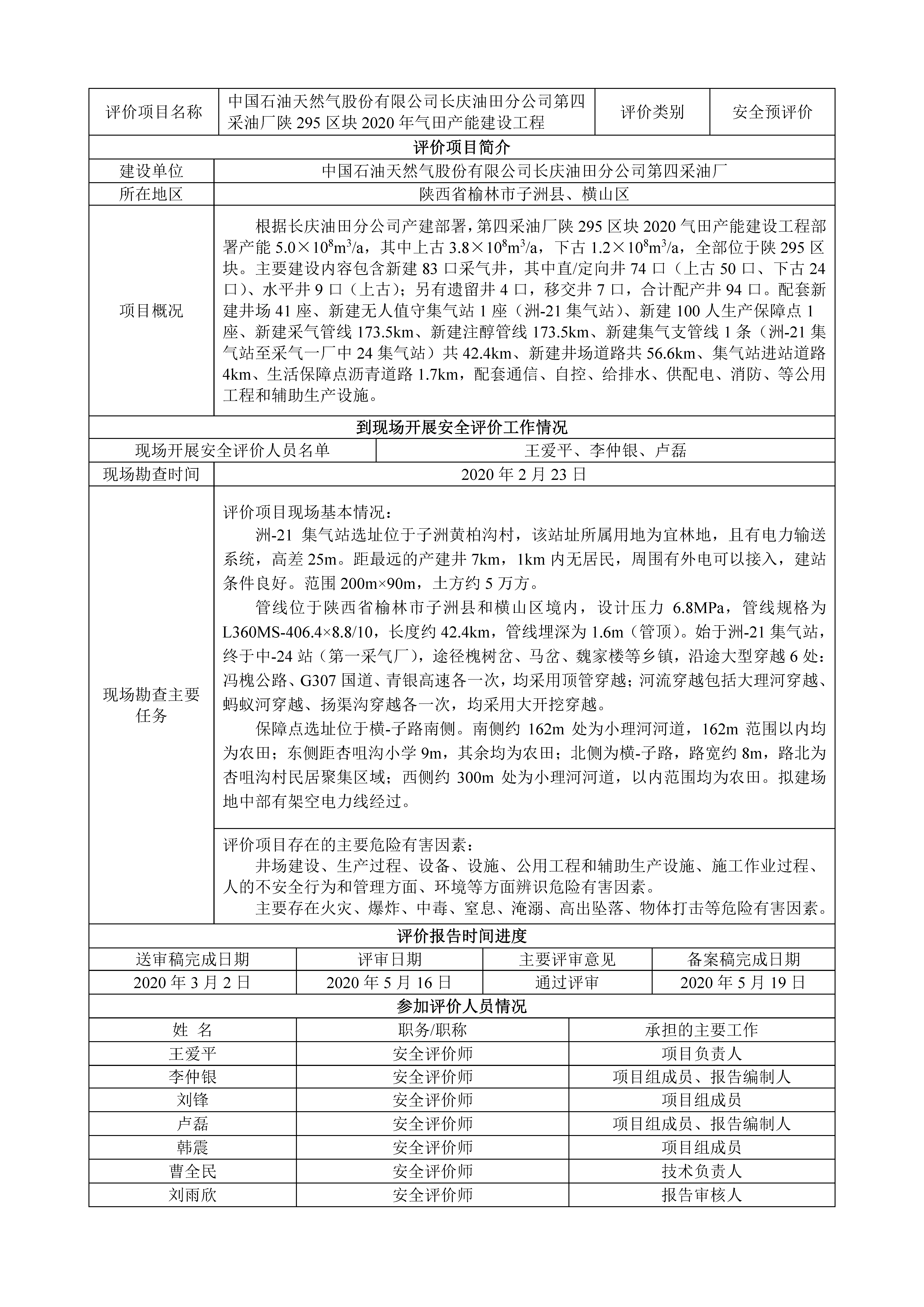 KLDAP[2020]-非煤-預(yù)-1 中國石油天然氣股份有限公司長慶油田分公司第四采油廠陜295區(qū)塊2020年氣田產(chǎn)能建設(shè)工程安全預(yù)評(píng)價(jià)