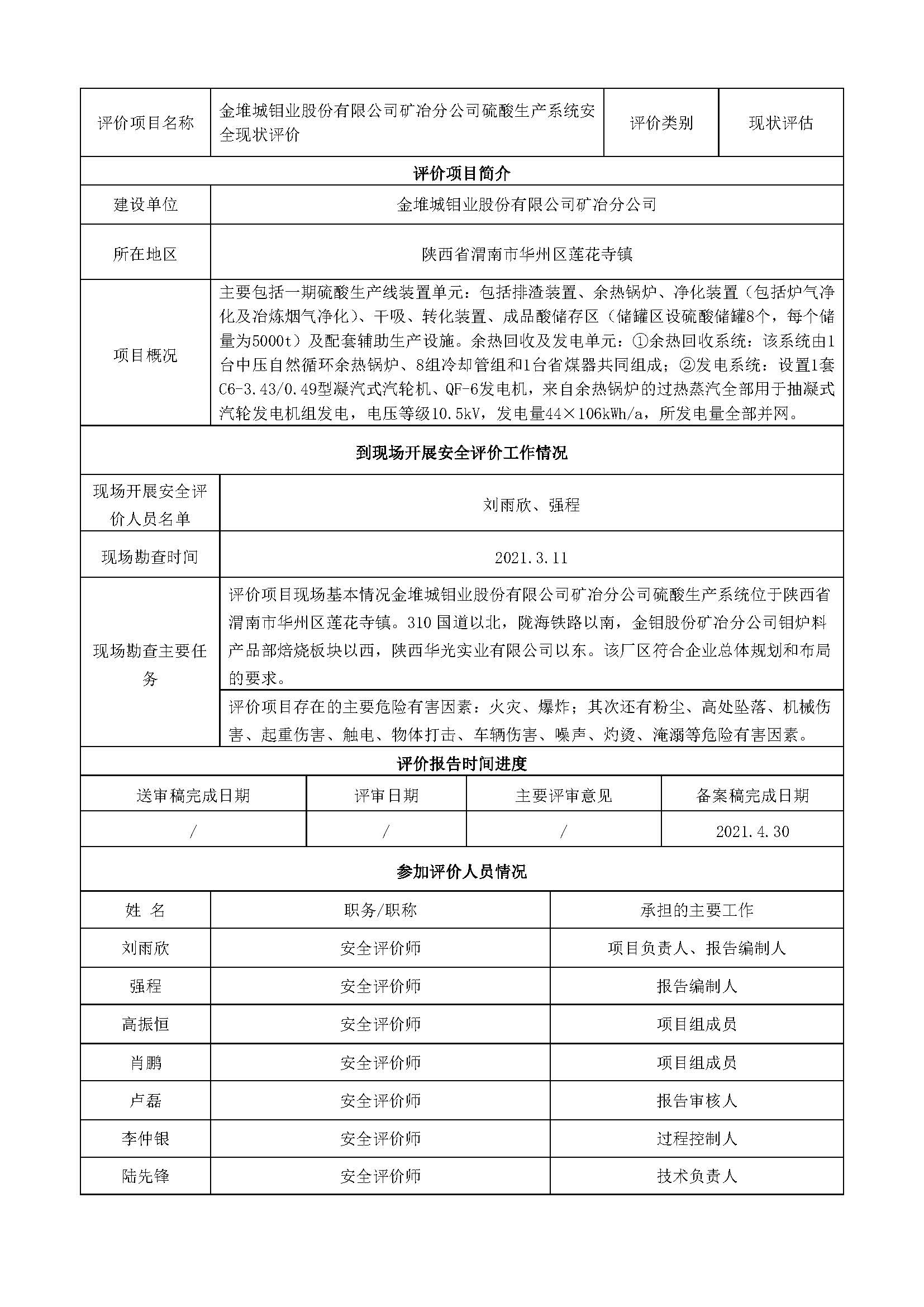 KLDAP[2021]-危化-現(xiàn)-4-金堆城鉬業(yè)股份有限公司礦冶分公司硫酸生產(chǎn)系統(tǒng)安全現(xiàn)狀評(píng)價(jià)項(xiàng)目安全現(xiàn)狀評(píng)價(jià)