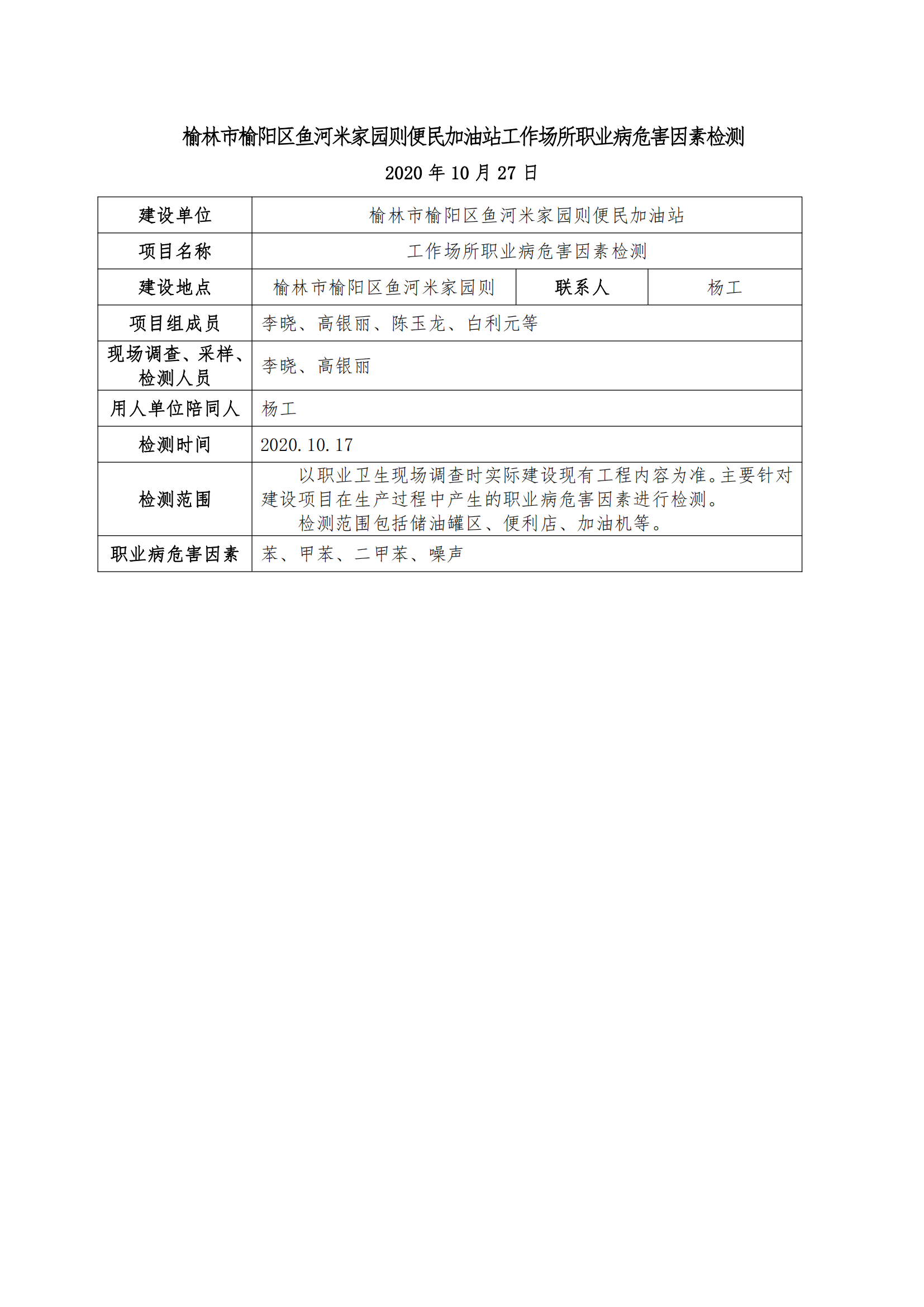 榆林市榆陽區(qū)魚河米家園則便民加油站工作場所職業(yè)病危害因素檢測