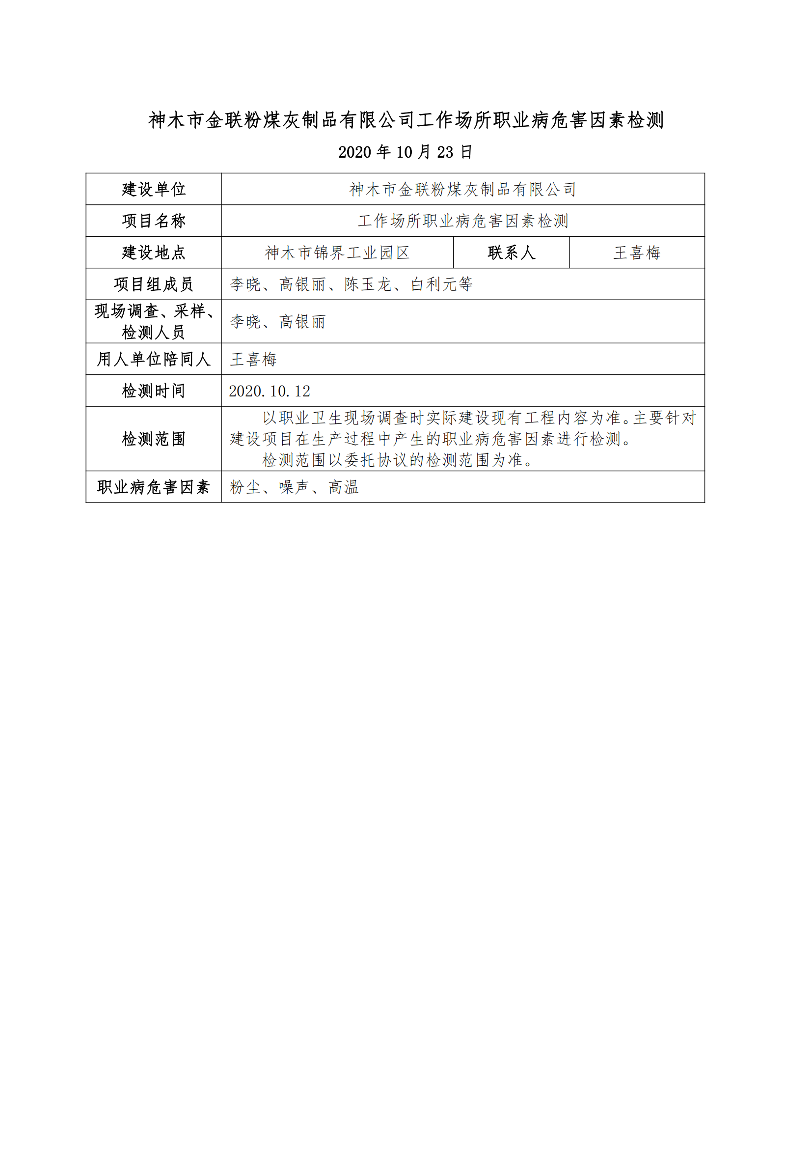 神木市金聯(lián)粉煤灰制品有限公司工作場(chǎng)所職業(yè)病危害因素檢測(cè)