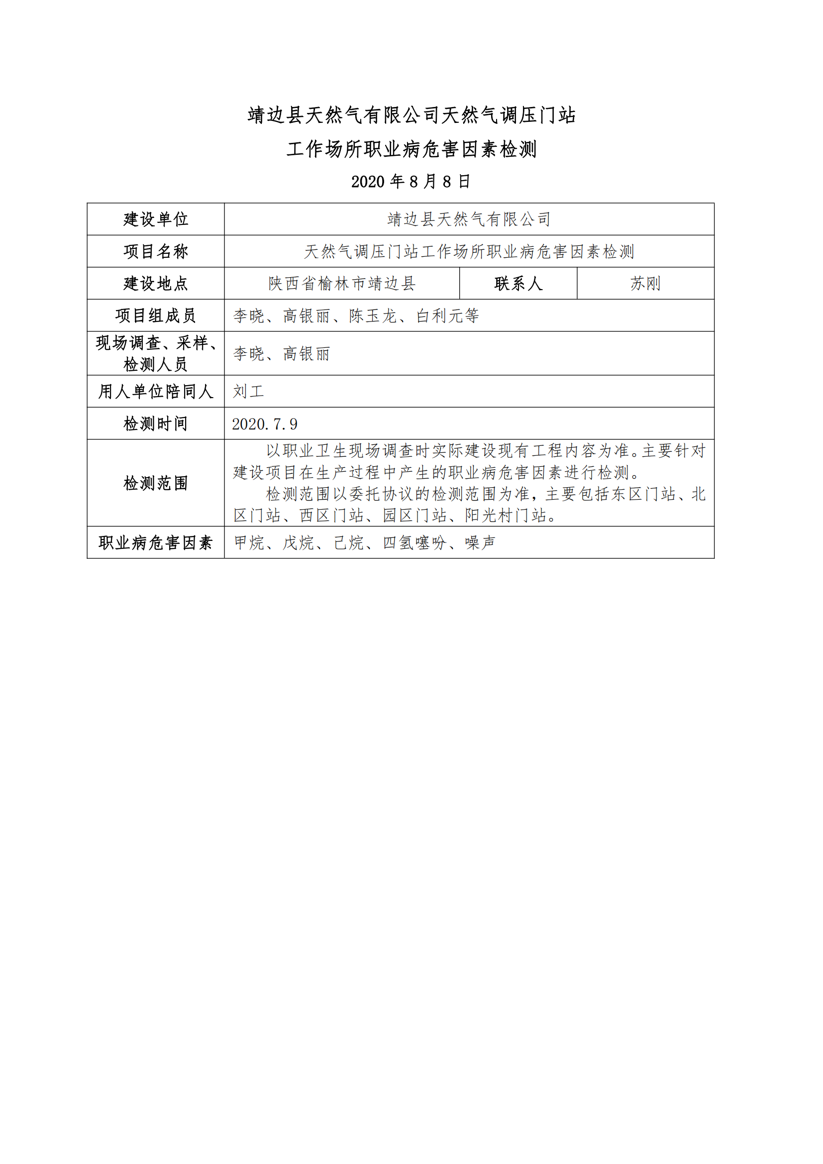 靖邊縣天然氣有限公司天然氣調(diào)壓門站工作場所職業(yè)病危害因素檢測