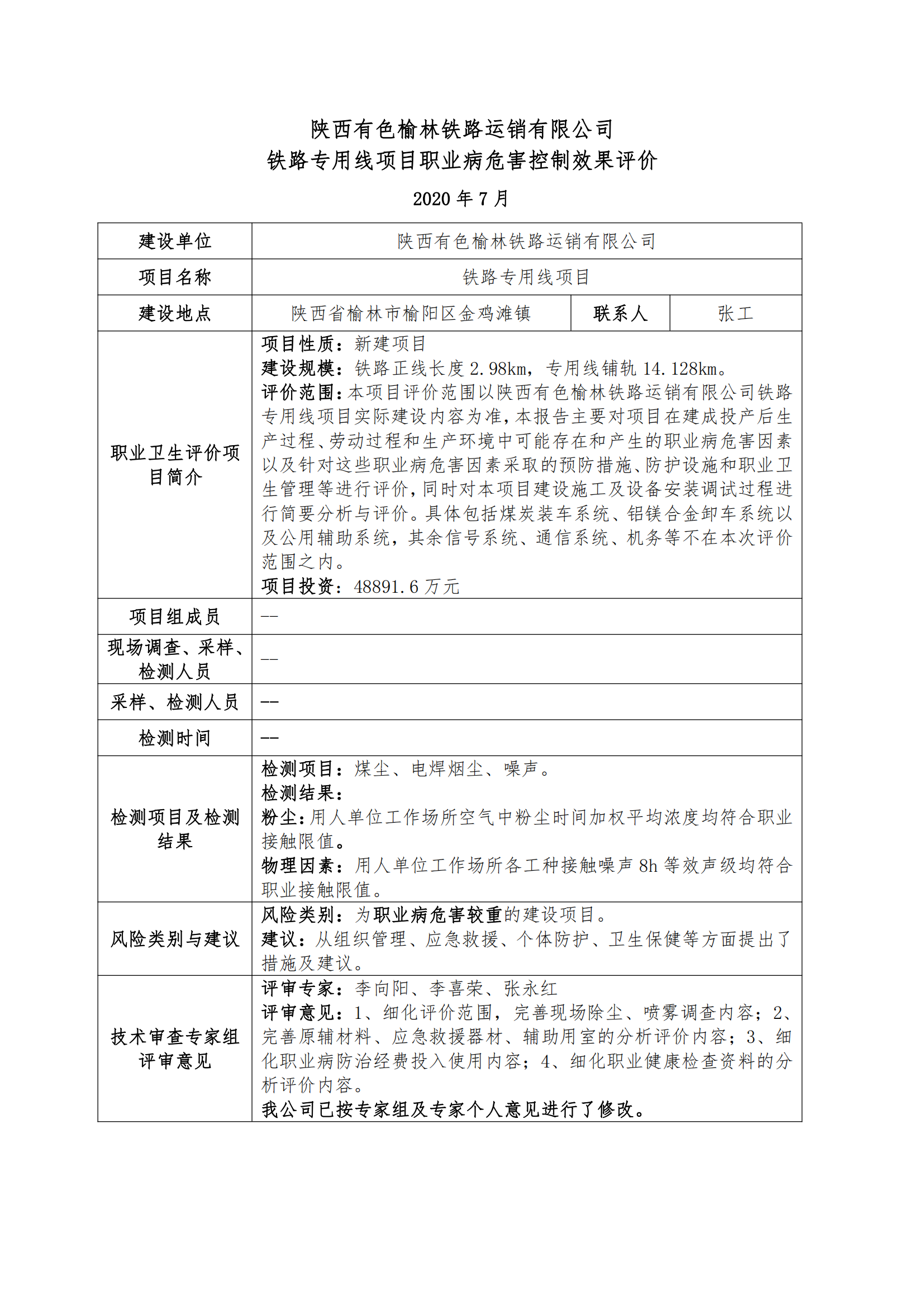 陜西有色榆林鐵路運銷有限公司鐵路專用線項目職業(yè)病危害控制效果評價