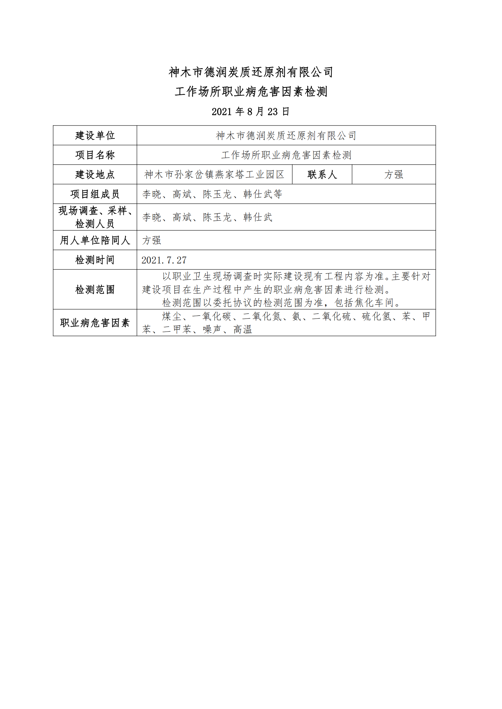 神木市德潤炭質(zhì)還原劑有限公司工作場所職業(yè)病危害因素檢測