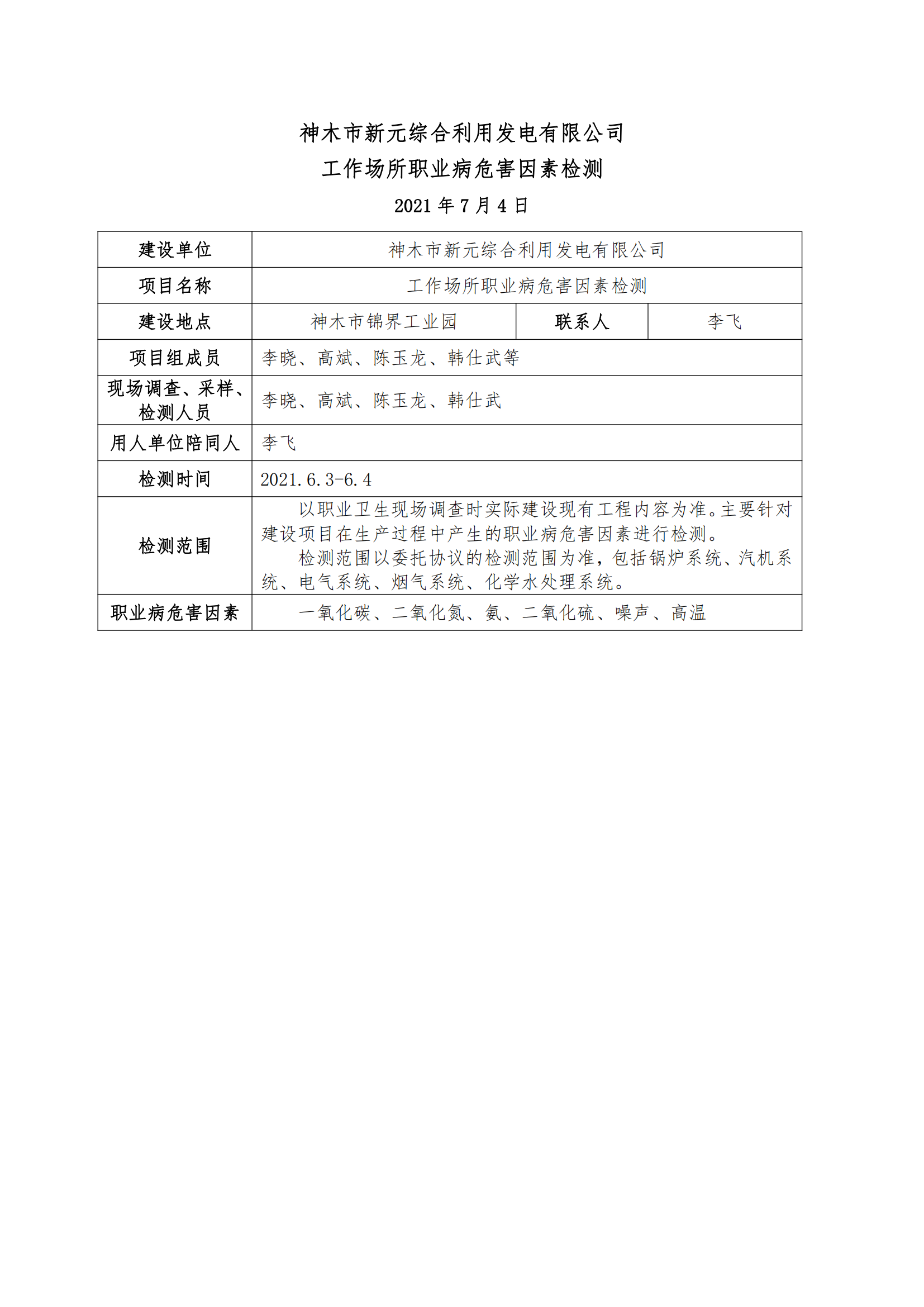 神木市新元綜合利用發(fā)電有限公司工作場(chǎng)所職業(yè)病危害因素檢測(cè)