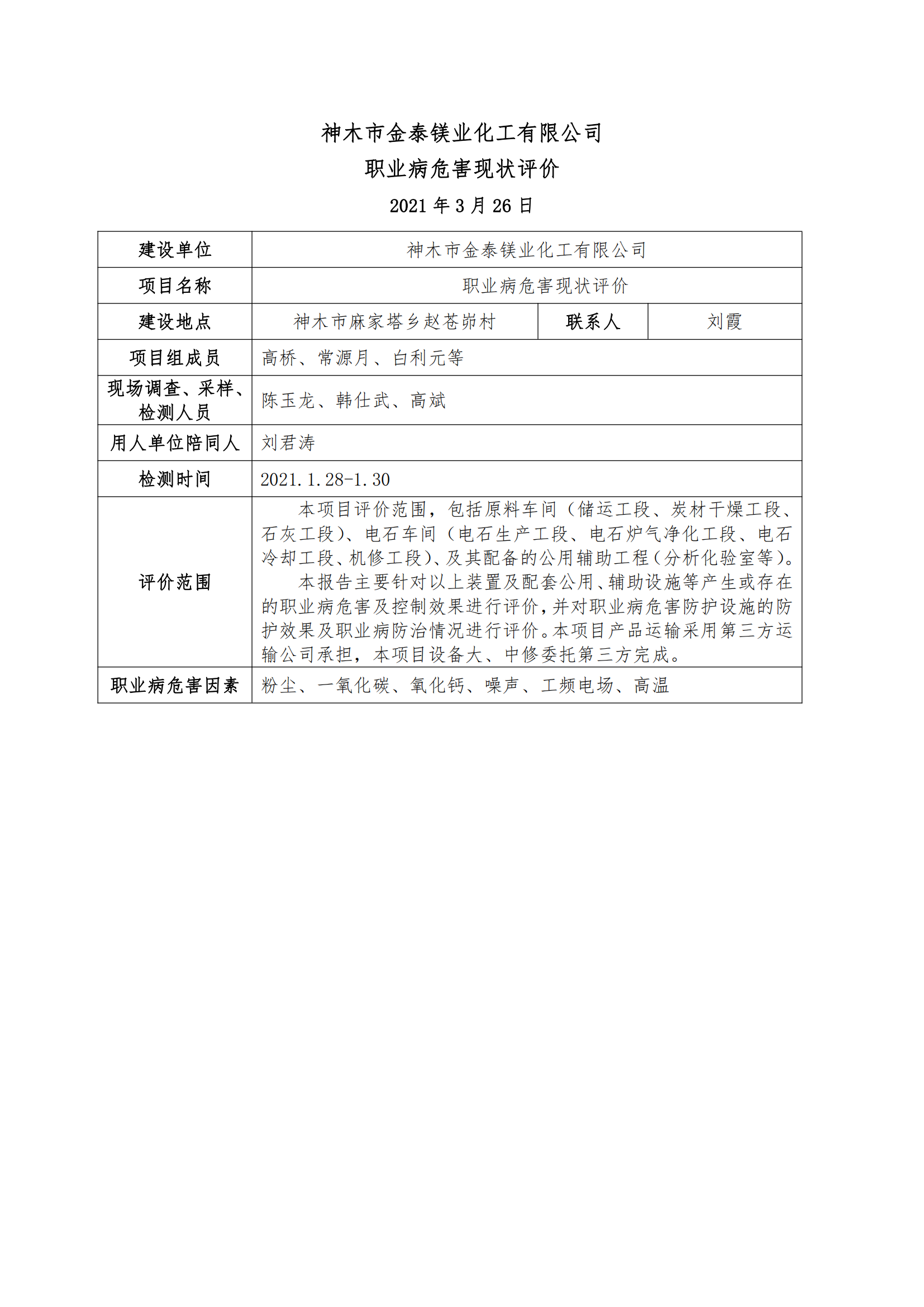 神木市金泰鎂業(yè)化工有限公司職業(yè)病危害現(xiàn)狀評(píng)價(jià)