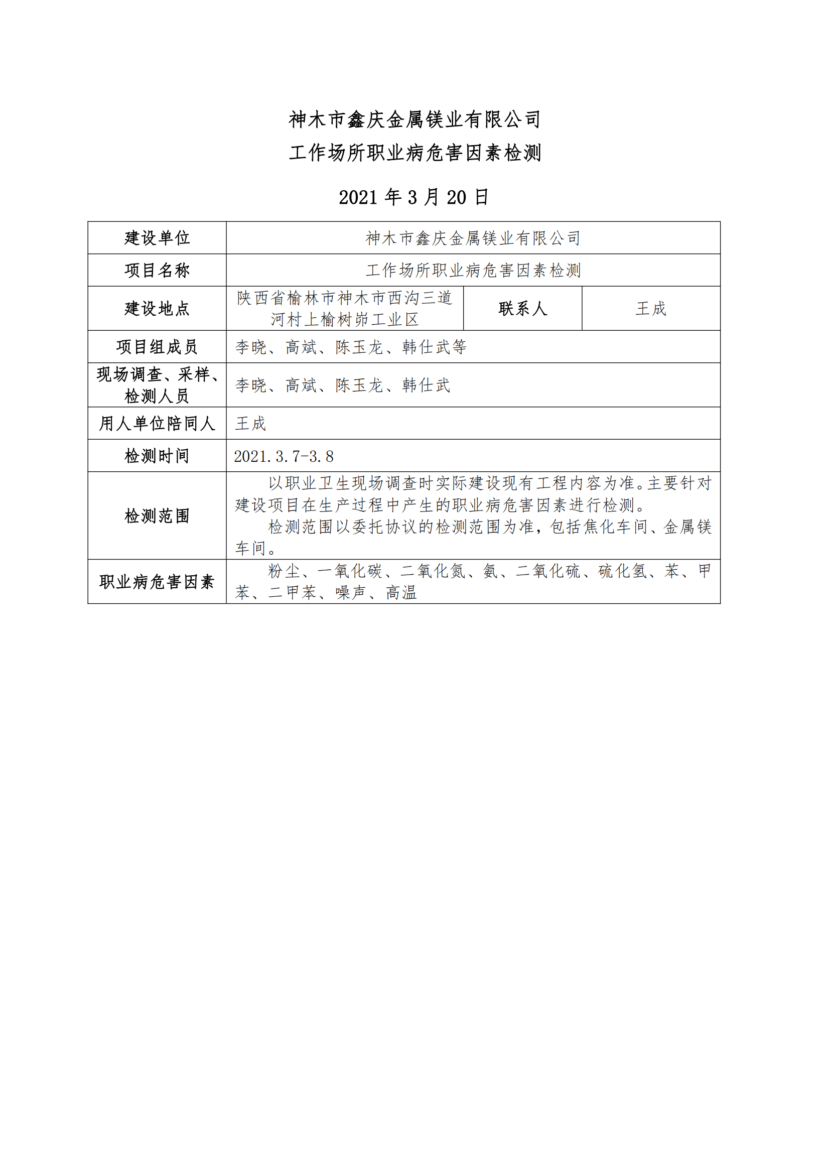 神木市鑫慶金屬鎂業(yè)有限公司工作場所職業(yè)病危害因素檢測