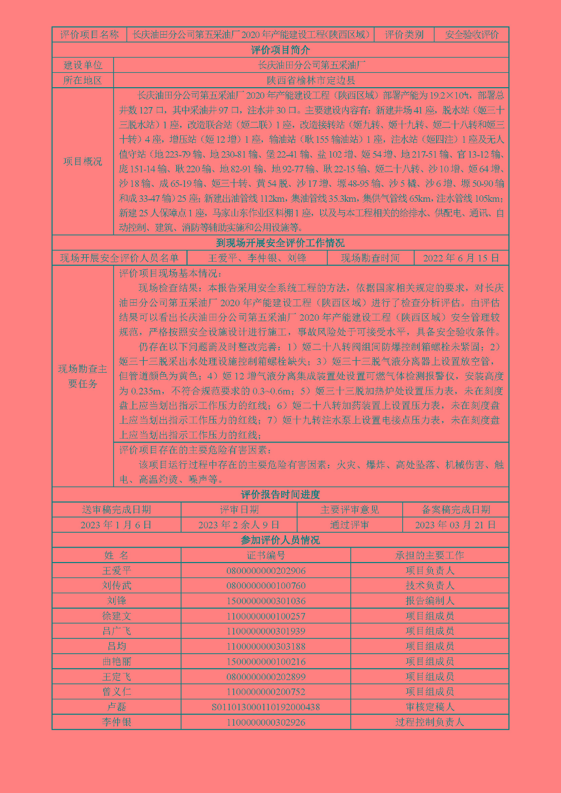 KLDAP[2022]-4.7 長慶油田分公司第五采油廠2020年產(chǎn)能建設(shè)工程(陜西區(qū)域)安全驗收評價