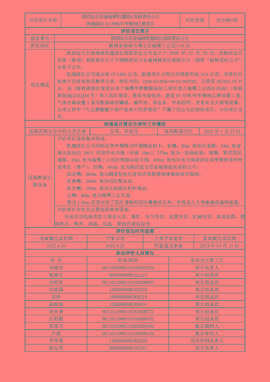 KLDAP[2022]-3.1 陜西延長石油榆林凱越煤化有限責任公司凱越煤化50萬噸年甲醇制乙醇項目安全預評價