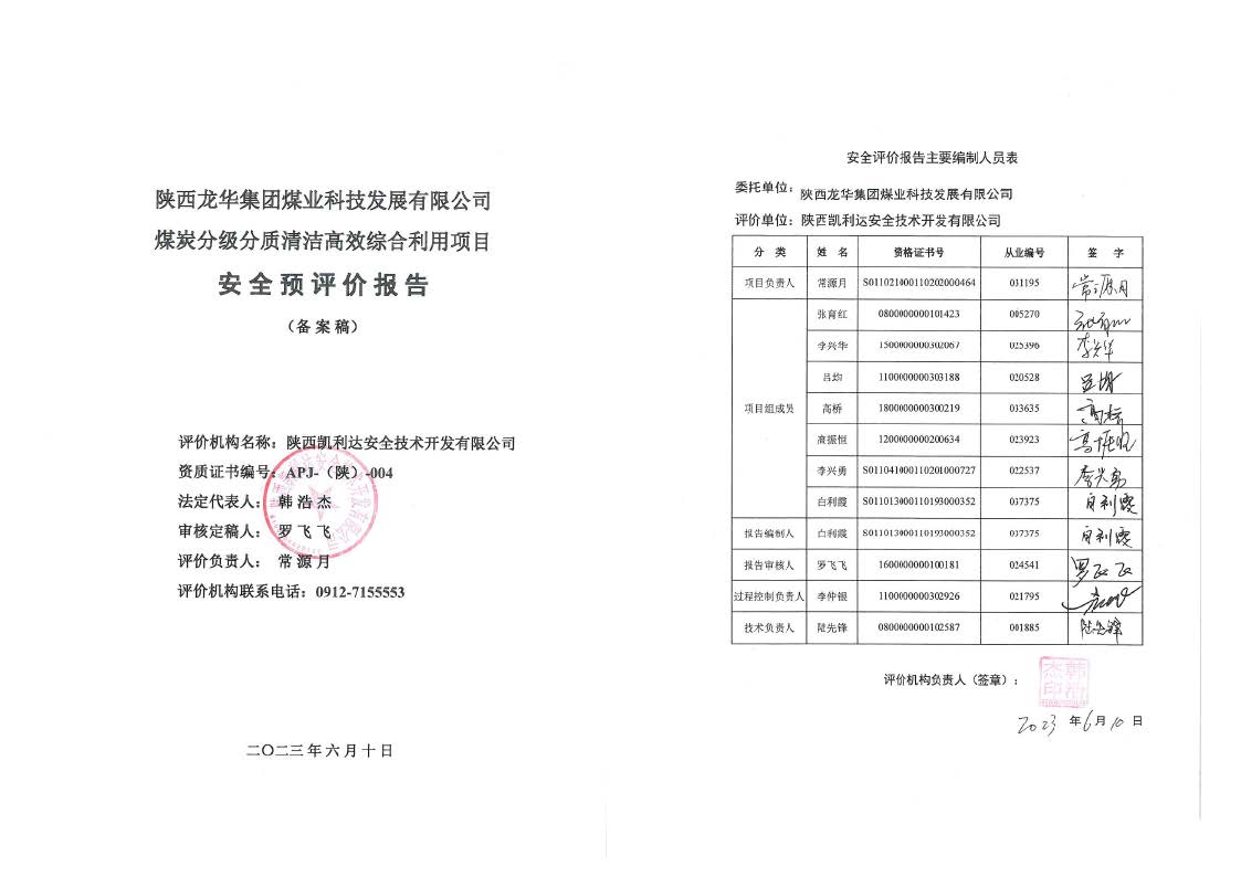 KLDAP[2023]-3.1 陜西龍華集團(tuán)煤業(yè)科技發(fā)展有限公司煤炭分級分質(zhì)清潔高效綜合利用項(xiàng)目安全預(yù)評價