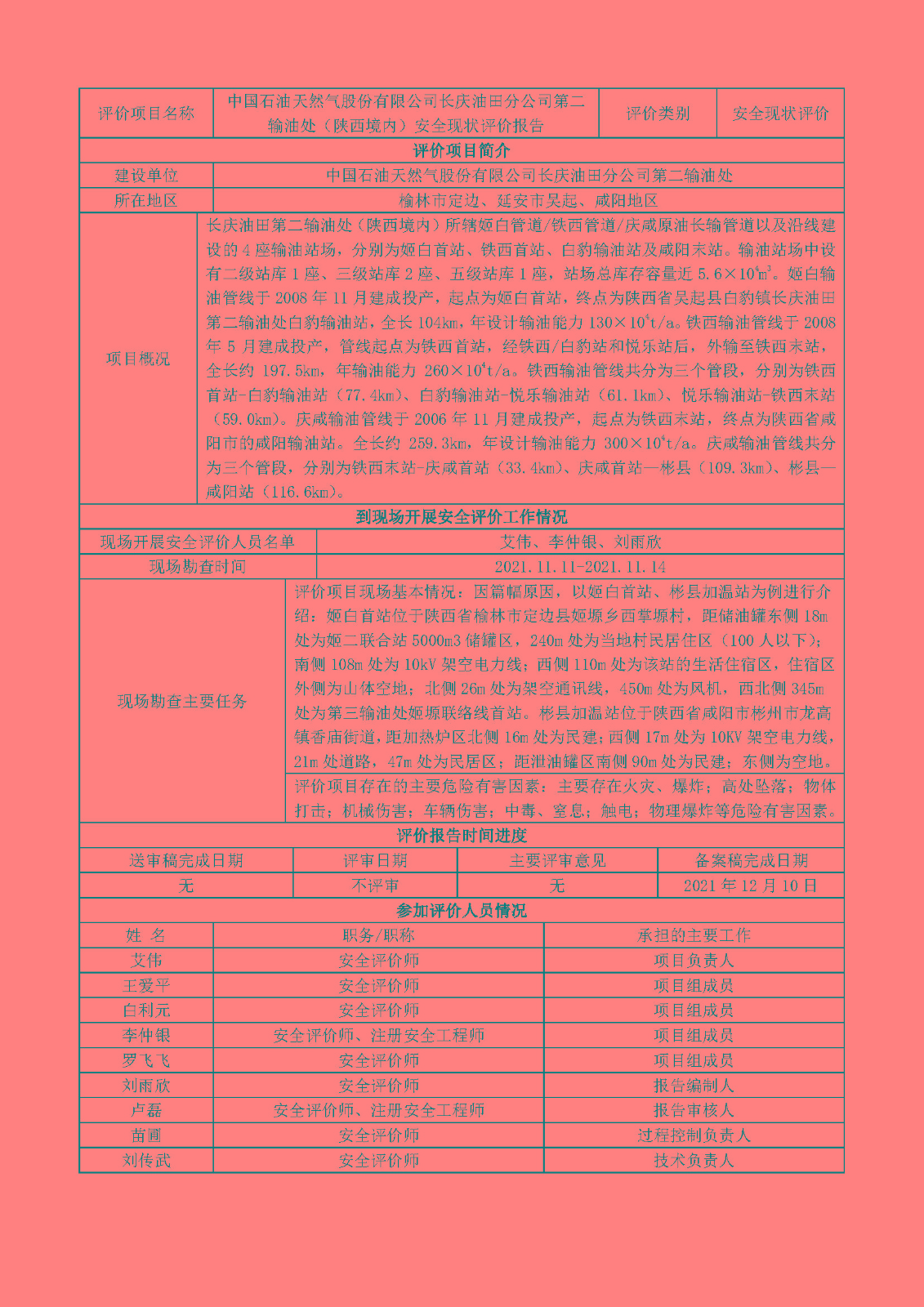 KLDAP-[2021]-2.5 中國石油天然氣股份有限公司長慶油田分公司第二輸油處2021年第二輸油處安全現(xiàn)狀評價