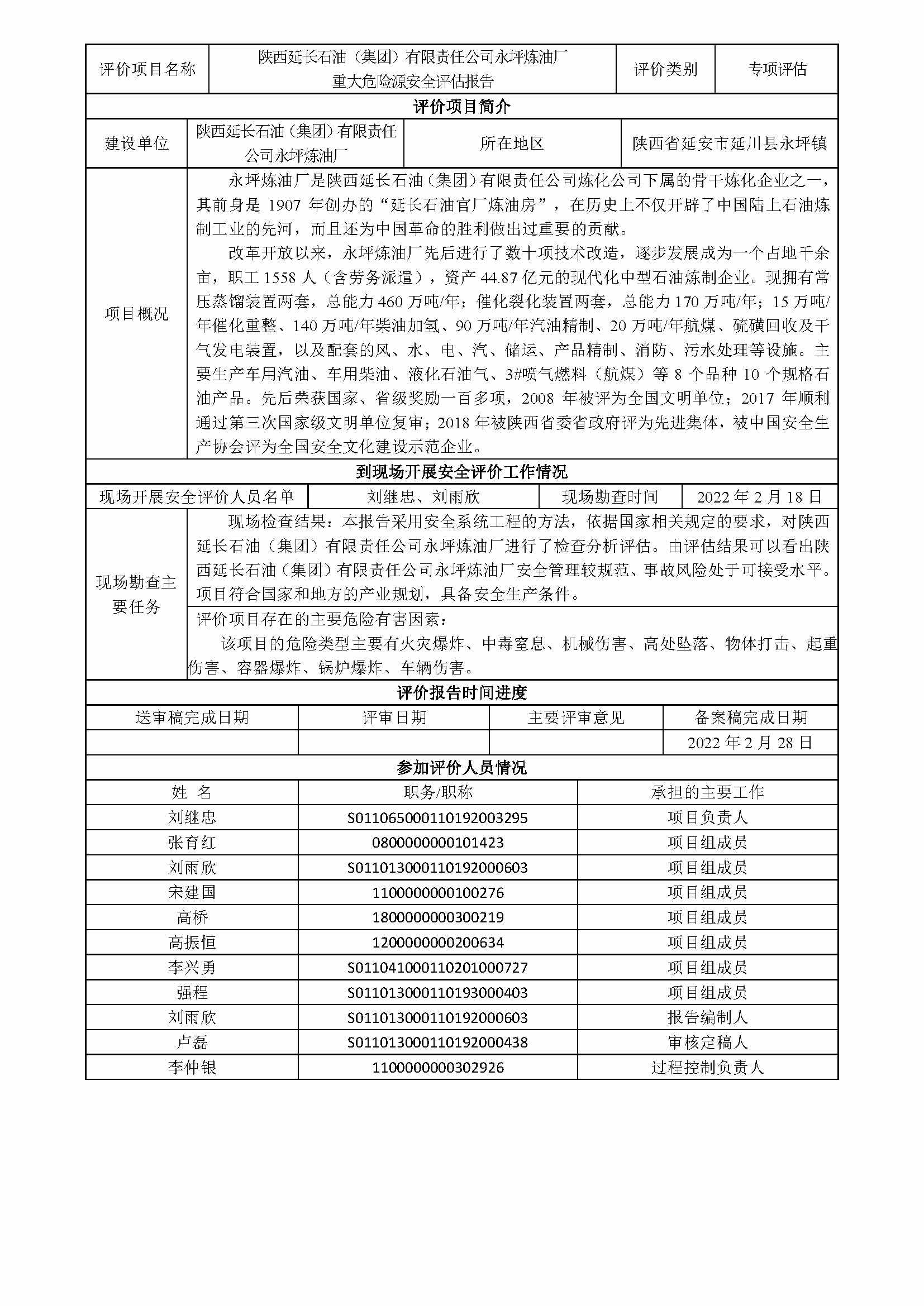 KLDAP-[2022]-2.1 陜西延長(zhǎng)石油(集團(tuán))有限責(zé)任公司永坪煉油廠危險(xiǎn)化學(xué)品重大危險(xiǎn)源評(píng)估