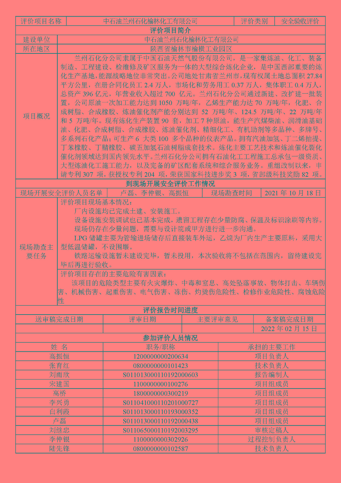 KLDAP[2021]-(驗)-21 中石油蘭州石化榆林化工有限公司乙烷制乙烯項目安全驗收評價
