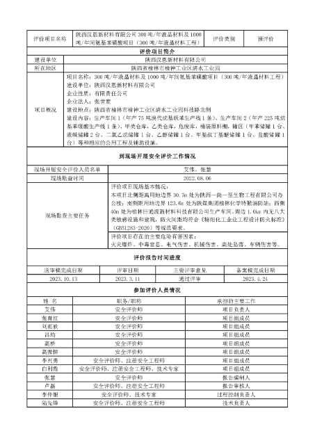 KLDAP[2022]-1.6 陜西漢恩新材料有限公司300噸/年液晶材料及1000噸年間氨基苯磺酸項目(300噸/年液晶材料工程)安全預評價