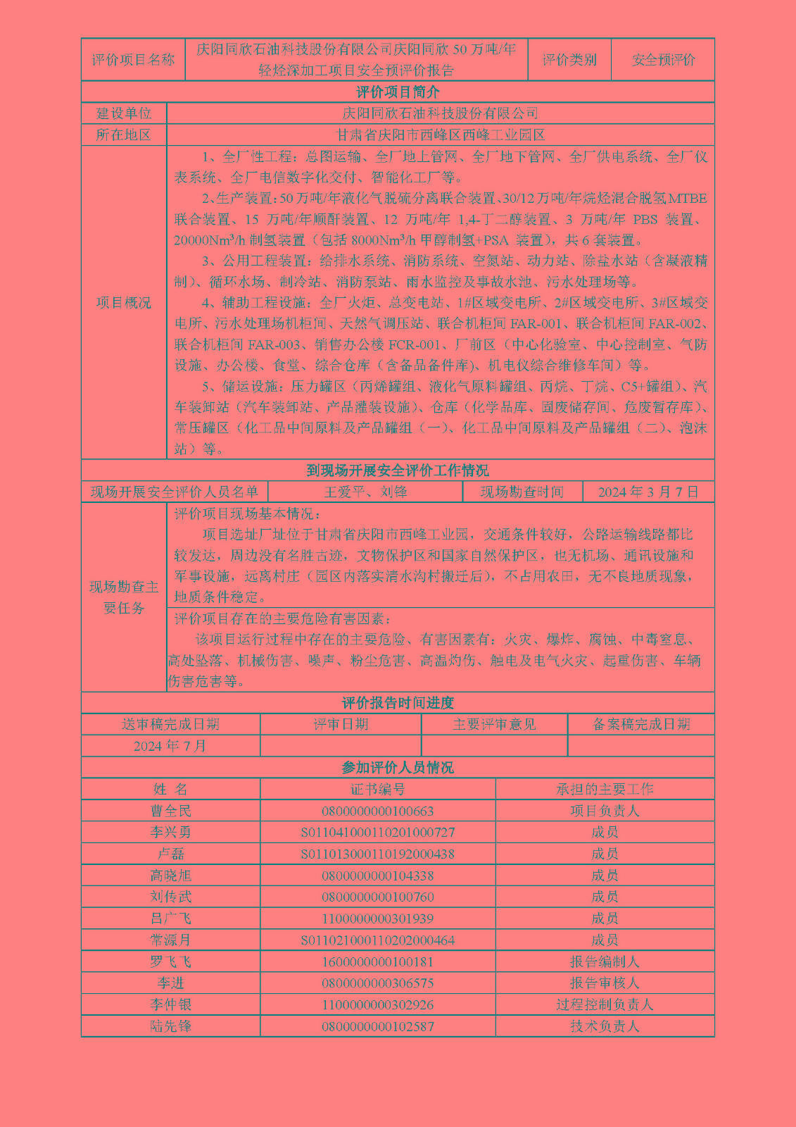 慶陽同欣石油科技股份有限公司慶陽同欣50萬噸/年輕烴深加工項目安全預評價報告