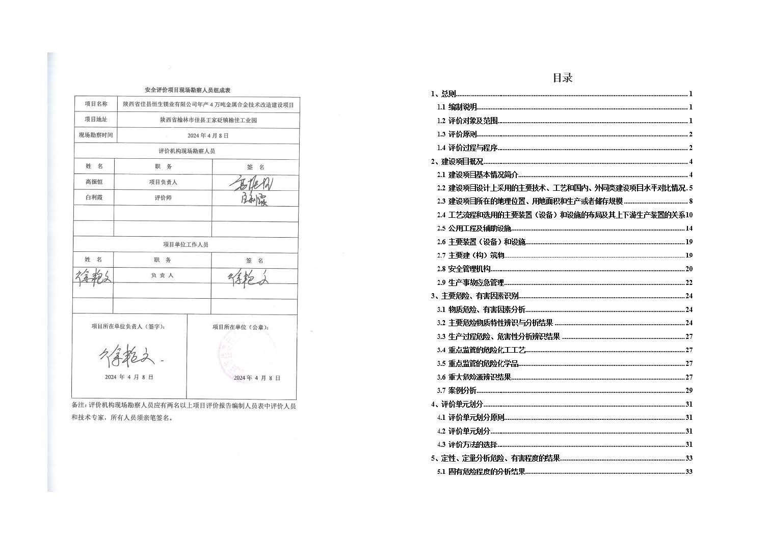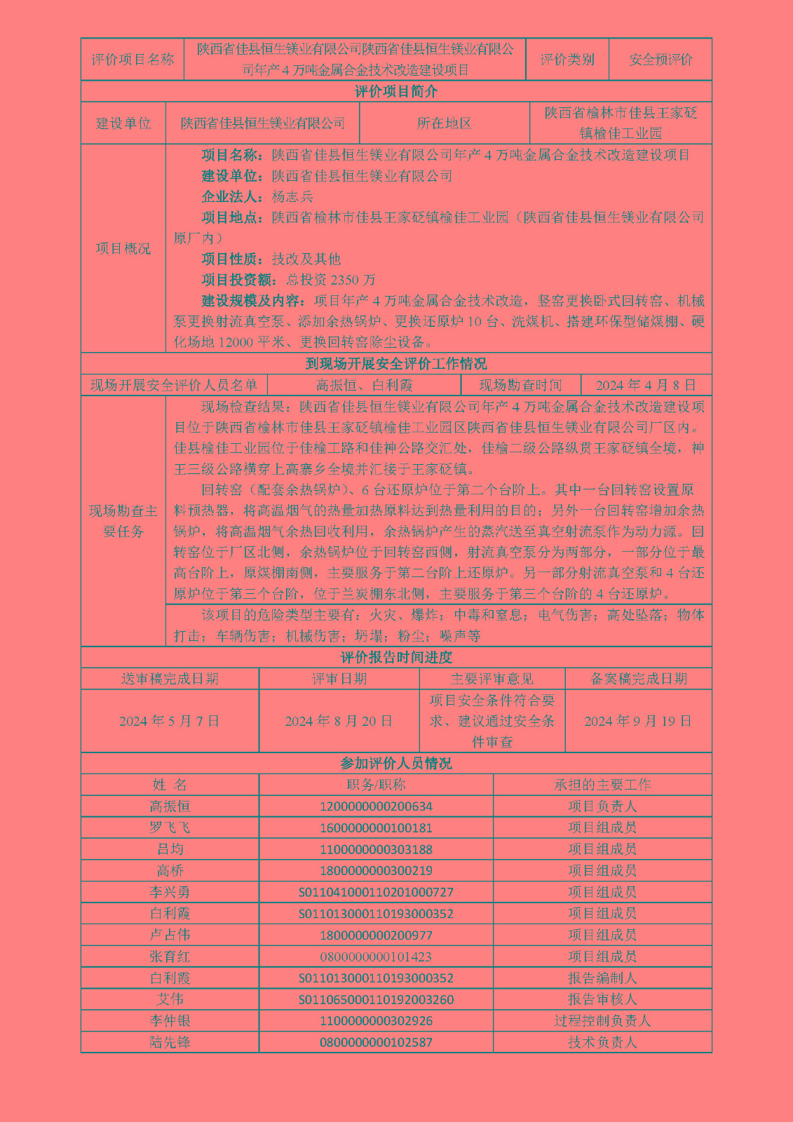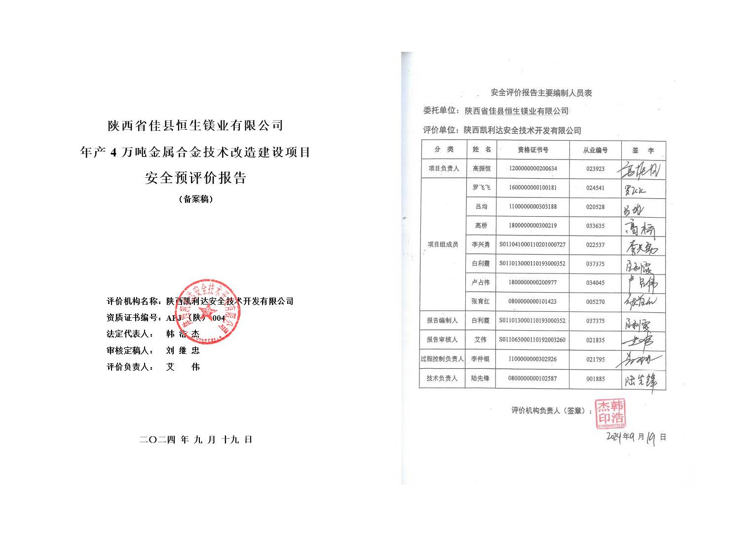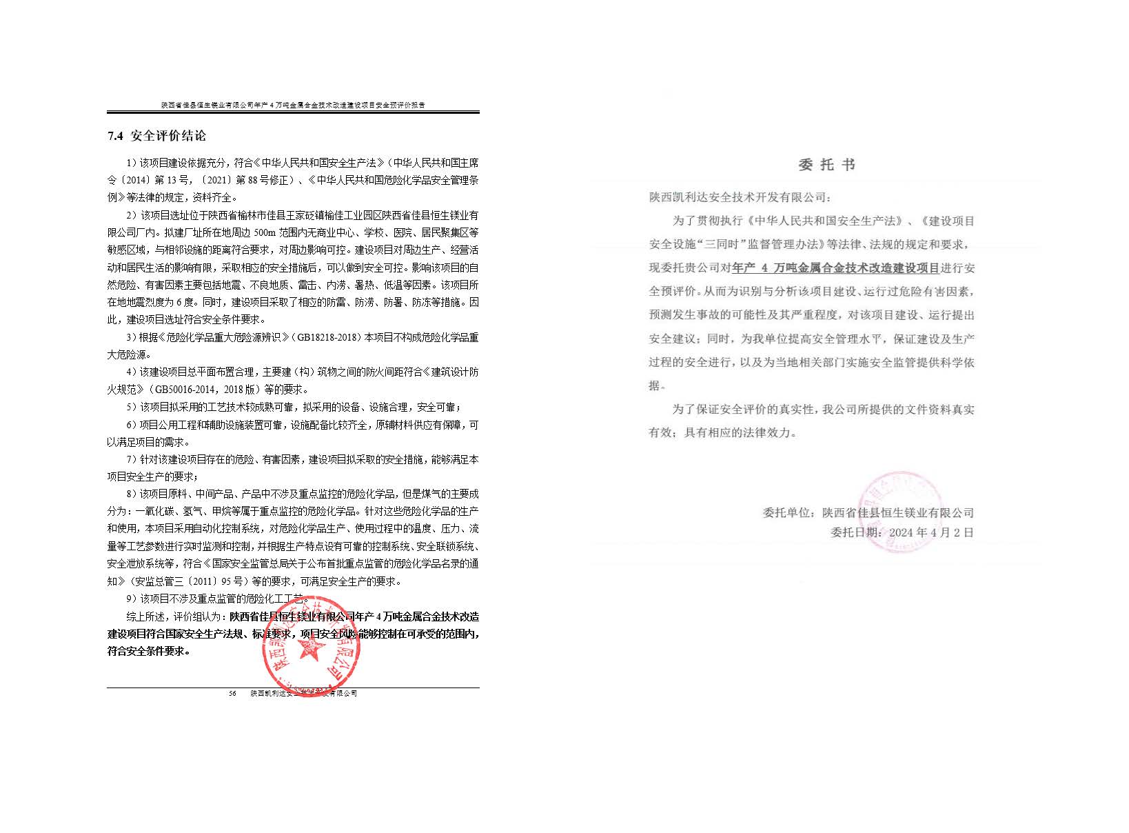 KLDAP[2024]-3.6陜西省佳縣恒生鎂業(yè)有限公司年產(chǎn)4萬噸金屬合金技術(shù)改造建設(shè)項目安全預(yù)評價