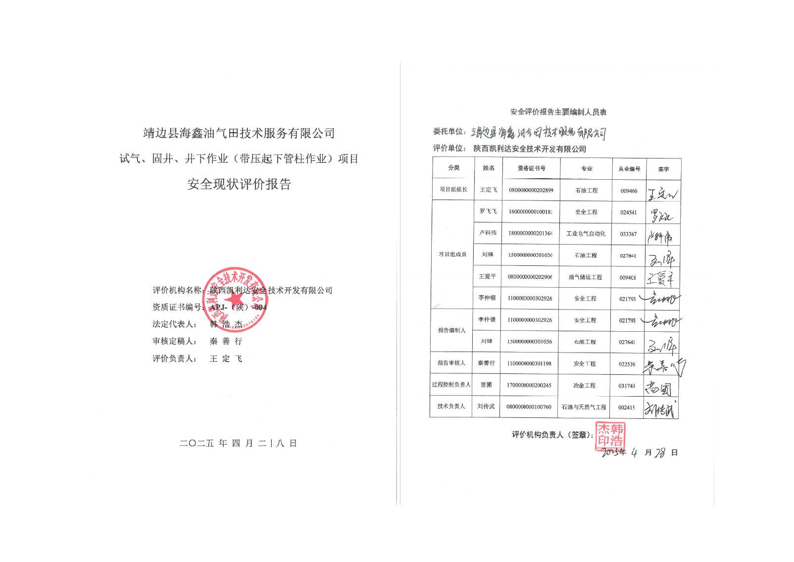 KLDAP[2025]-1.20靖邊縣海鑫油氣田技術(shù)服務(wù)有限公司試氣、固井、井下作業(yè)(帶壓起下管柱作業(yè))項目安全現(xiàn)狀評價