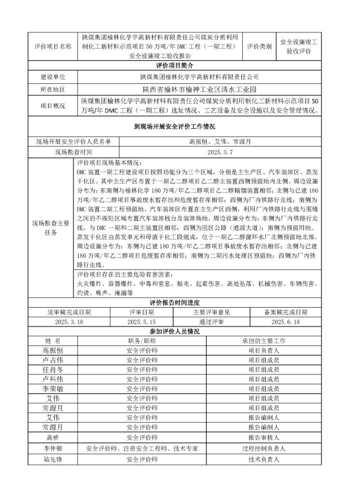 當(dāng)前位置: 項(xiàng)目管理 > 安全評(píng)價(jià)項(xiàng)目公示 > 2025年 >KLDAP[2025]-2.11-陜煤集團(tuán)榆林化學(xué)宇高新材料有限責(zé)任公司煤炭分質(zhì)利用制化工新材料示范項(xiàng)目50萬噸年DMC工程(一期工程)安全設(shè)施竣工驗(yàn)收評(píng)價(jià)
